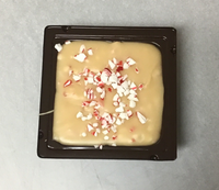 Festive fudge crafted with cane sugar, white chocolate, cream, peppermint oil and NonGmo corn syrup, cooked just right in a jumbo copper pot then poured into a 4 oz square for cooling and packaging in a cellophane bag tied with a ribbon - a festive treat!